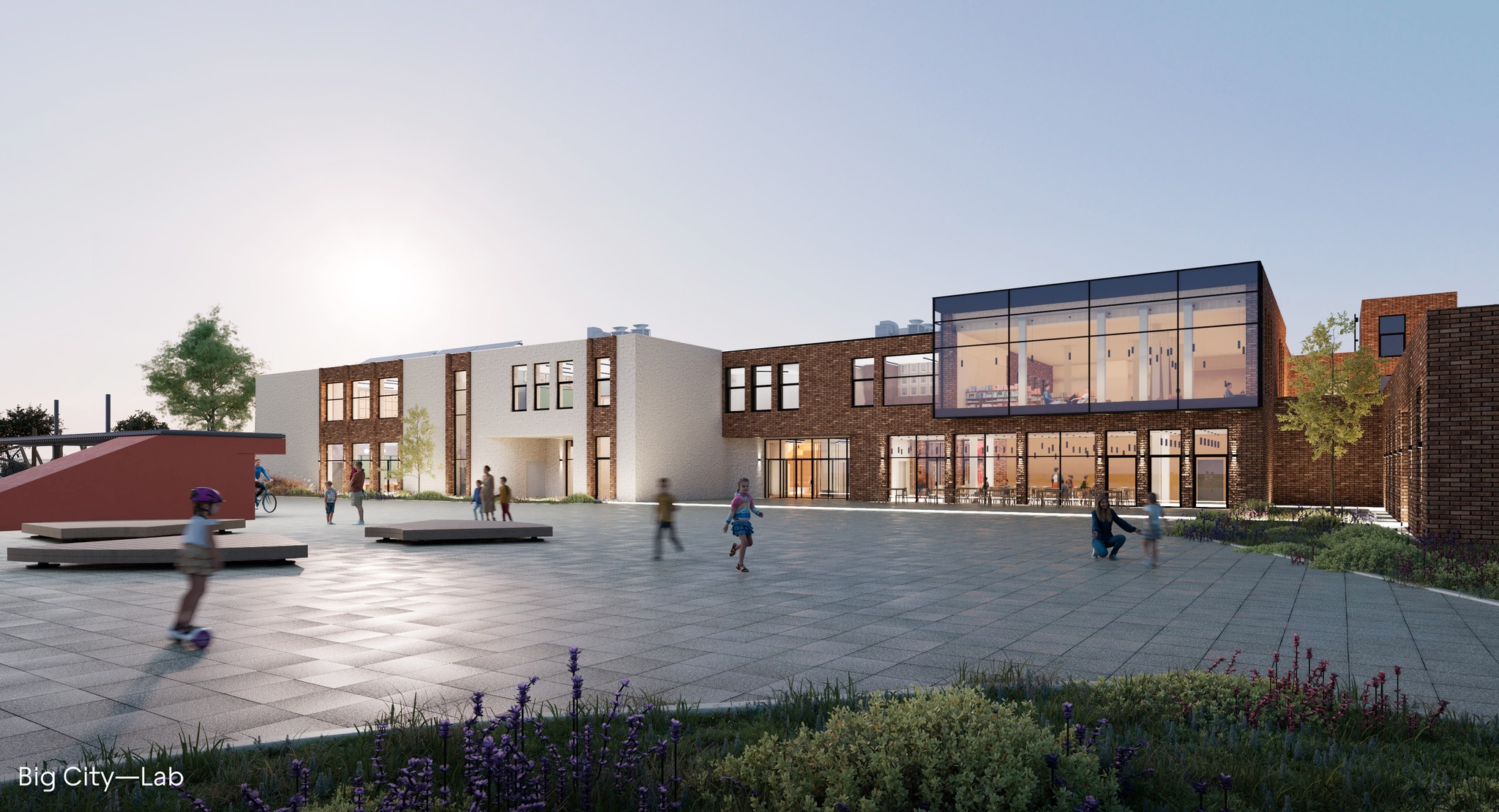 Будівля складатиметься з пʼяти блоків. Крім навчальних класів початкової школи та гімназії, тут передбачена актова зала для заходів, спортзал та бібліотека-коворкінг. Сучасний підхід застосований і до шкільної їдальні — вона буде облаштована у форматі кафетерію. Відповідно до розробленої концепції на території закладу передбачається будівництво протирадіаційного укриття. Проєкт розроблений урбан-бюро Big City Lab.