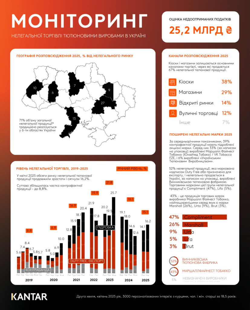 На підставі трьох “хвиль” дослідження КАНТАР Україна прогнозує, що річний обсяг тіньового сектору тіньового ринку складатиме 5,3 млрд штук сигарет (265 млн пачок), що еквівалентно недоотриманню зведеним бюджетом 25,65 млрд податкових надходжень. Відповідні цифри будуть скориговані за результатами четвертої “хвилі” дослідження. У 2024 році відповідні показники складали 6,33 млрд штук сигарет (316,5 млн пачок) та 21,9 млрд грн відповідно. Більші недонадходження при меншому обсязі тіньового сектору в 2025 році обумовлені підвищенням ставок акцизного податку майже на 23,5%.