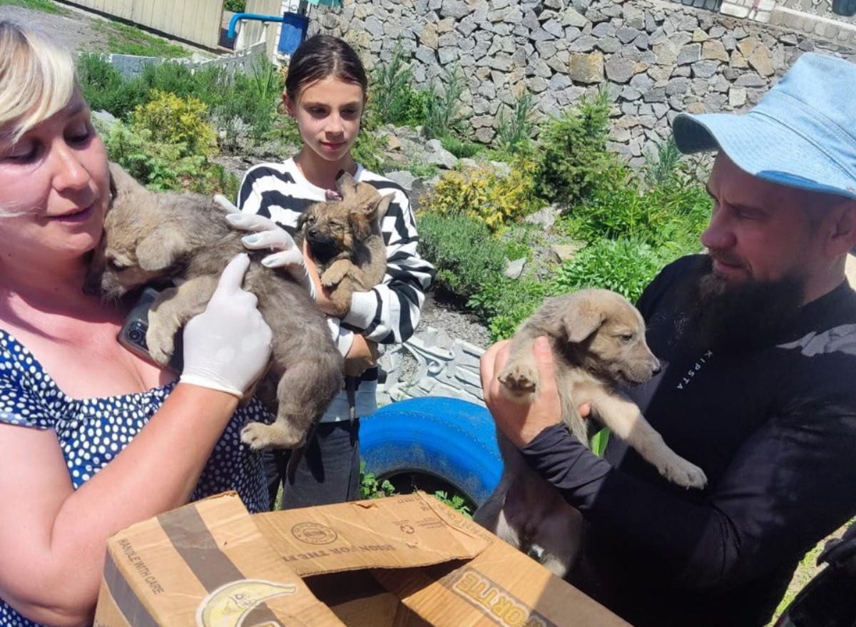 “Тварин вивозили наші волонтери Сергій та Володимир. Дорогою до Херсону про них дізнались інші військові, які дуже просили забрати 8 цуценят. На щастя, Тетяна Нельга із притулку «Зоосім’я» прийняла їх. Щоправда, у машині для цуців вже не вистачило переносок, тому вони мандрували в коробці. Скажіть, малі схожі на вовченят?” – зазначили в UAnimals.