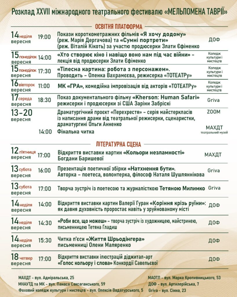 Штаб-квартирами фестивалю будуть Херсон і Миколаїв, також театри показуватимуть вистави на своїх сценах і запрошуватимусь на вистави ВПО з Херсонщини.