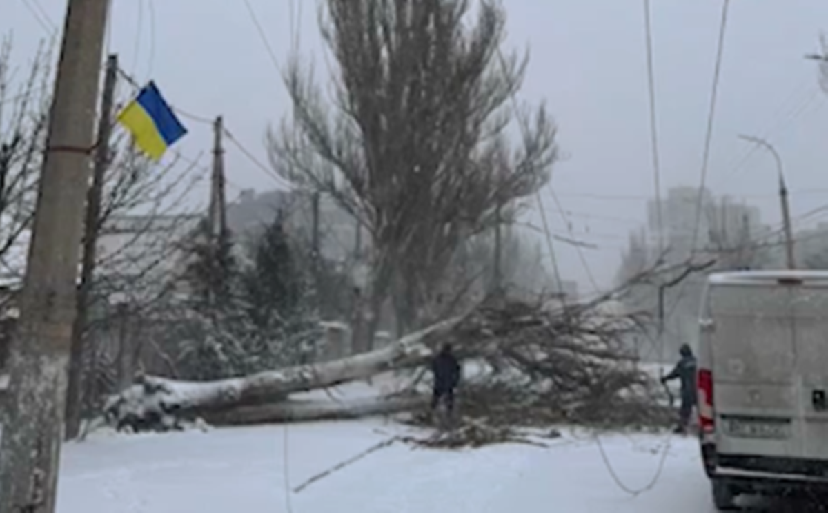 Погіршення погодних умов додало херсонцям проблем. Сильний вітер повалив дерева, які порвали дроти та частково перекрили вулиці. Дороги замело снігом.